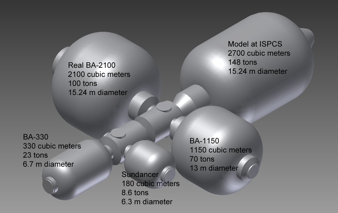 The difference becomes even clearer when an actual 2100 cubic meter, 7.6 meter module is compared to the modeled monster module. Below is an image showing representations of a Sundancer and a BA-330 docked to a pair of nodes modeled after Nodes 2 and 3 of the International Space Station. Also docked are the BA-1150 and BA-2100 models I created with accurate volumes, and the monster module they were showing off at ISPCS. All modules have inflated diameters and a launch mass (estimated from density in the case of monster module) noted.